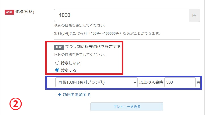 「価格(税込)」項目下部に【 プラン別に販売価格を設定する 】の選択項目で【設定する】を選択(赤枠参照)