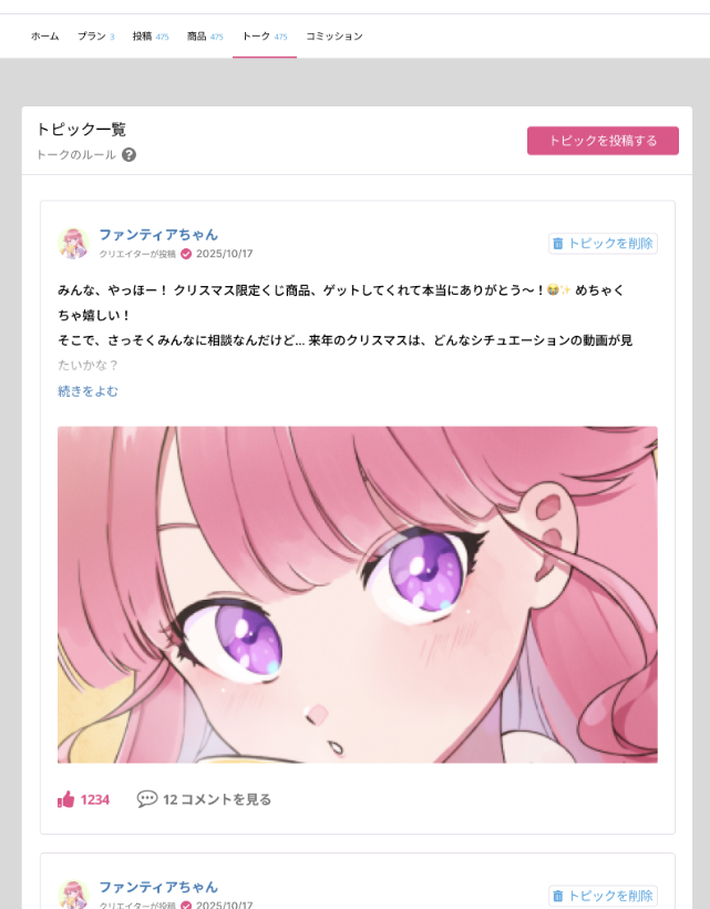 誠に恐れ入りますが、ファンティアのシステム上、無料プランを削除することはできません。 ただし、加入人数の上限(最低1人)を設定することは可能ですので、 上限1人に設定後、別のアカウントでご自身のファンクラブに加入すること […]